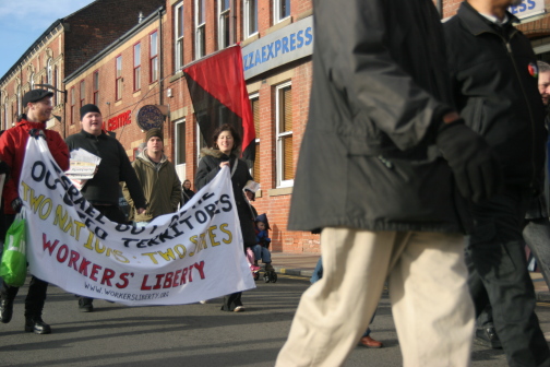 The AWL are essentially left-wing apologists for western imperialism, they have opposed the slogan "Troops Out Now" in relation to the occupation of Iraq. Sean Matgamna, one of their founders, has written [5] that "the politics of the [Gaza] demonstrations have been provided by the Islamic chauvinists... the big demonstration on 10 January in London was an Arab or Islamic chauvinist, or even a clerical-fascist, demonstration... The clerical fascists have politically hegemonised the demonstrations to an astonishing degree. These have not been peace demonstration, but pro-war, and war-mongering, demonstrations - for Hamas's war, and for a general Arab war on Israel." He goes on to say that "The Muslim communities are part of a world-wide movement which includes states and some of the richest people on earth (in Saudi Arabia, etc.) This world-wide movement is, in political terms, very reactionary... The serious left has to find ways of supporting the Muslim communities against racism, discrimination, and social exclusion, without accommodating politically or socially to their reactionary traits".