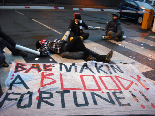 This morning, 6 Newcastle-based protesters decided to expose the fact that killing machines are being made in our neighbourhood. 5 protesters lay in front of the main gates in a ‘die-in’ protest, surrounded by ‘blood money’ to represent the incredible ill-gotten gains of BAE Systems. They used arm locks to ensure that they could not be easily moved on by police, and blocked the entrance for more than an hour.