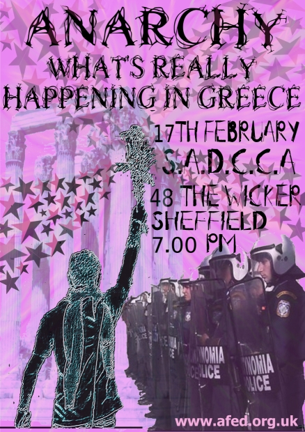 The riots in Greece have been widely covered in the British media with journalists typically focusing on clashes with police and the violence on the streets. Come hear a Greek activist speak about what is really going on on the ground, how Greeks are struggling to create a fairer and more democratic society and how workers are demanding a world free from the chaos of economic crisis. Hosted by Sheffield Anarchist Federation.