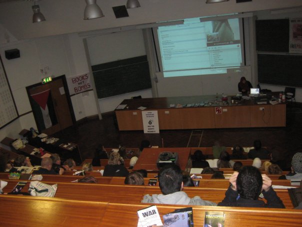 Representing a number of different political groupings, the students have been busy spreading the word, contacting and receiving messages of support from the likes of Naom Chomsky and at 2 pm today they were involved in a video link up with Palestinian students from the Jabaliya district of Gaza.