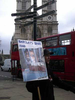 Only three of us for another mini demo inside the 'SOCPA-zone' where we protested against Barclays (biggest HLS shareholder), but we still managed to do a decent little demo while leafletting about this Friday's march. We managed about 40 minutes of a demonstration before being told to clear off by a sergeant. It's a free society to demonstrate as long as you get permission and give 6 days notice! What a joke! Anyway, SHAC doesn't care about SOCPA and we'll be returning some time soon.