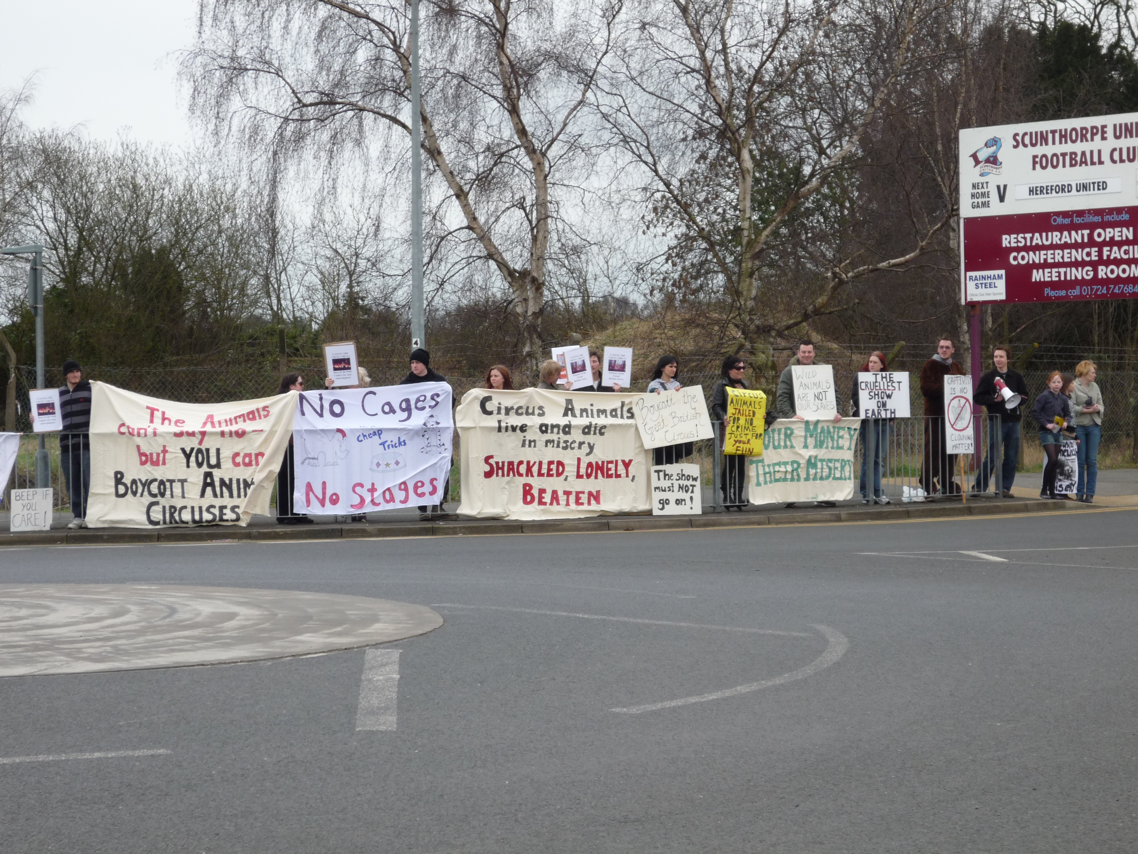 Animal rights activists from around the North gathered alongside concerned locals at Scunthorpe United F.C. with megaphones, banners, placards, and leaflets to make lots of noise and send out a strong message to the people of Scunthorpe about the plight of circus animals. Chris, a protestor, said: "We had a good turnout today and plenty of media attention. It's clear from the reaction provoked by the continued use of wild animals in circuses that there is firm determination from the full range of animal rights and welfare campaigners to put an end to this cruel practice."