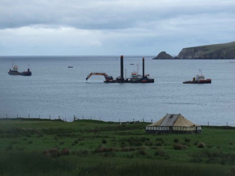 Dredging boats arrived in Broadhaven Bay on Sunday, May 10th, to start work on the trench which must be completed before the offshore pipe can be laid. The boats which belong to Van Oord, a Dutch company contracted by Shell, have been working on and off since then sometime in shifts of up to 48 hours. Erris In-Shore Fisherman’s Association blockaded Broadhaven Bay and Ballyglass pier for the last 2 days. The Van Oord boats include a suction dredger and two jack up barges. Several security boats and the occasional Garda boat accompany them. The Solitaire is expected to arrive in the coming weeks. Yesterday, a kayak team from Rossport Solidarity Camp paddled out to the suction dredger to talk with the crew about their motives, to inform them that the community does not welcome them here and there is no consent for the works being carried out. It took the rapid response security boats approximately an hour and a half to respond in their high speed boats, by which time the kayak team had tired of attempting to communicate, with the unresponsive crew.