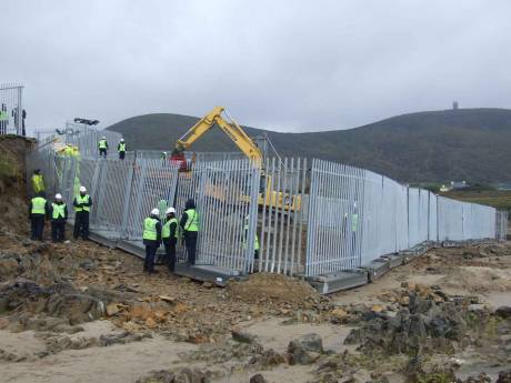 Work continues daily at the illegal Shell E&P Ireland compound at Glengad Beach in Erris, County Mayo, with the unlicensed fencing being extended past the high-water mark and the cliff being broken on May 15th, for the third time in the nine years since the project began. Cranes and winches arrived on the site on Monday May 18th. The convoy of trucks and it’s strong Garda escort were delayed when two cars, which met it at an impassable point on the road, coming in the opposite direction, would not reverse to allow the trucks pass. Both cars were towed away by a Garda jeep.