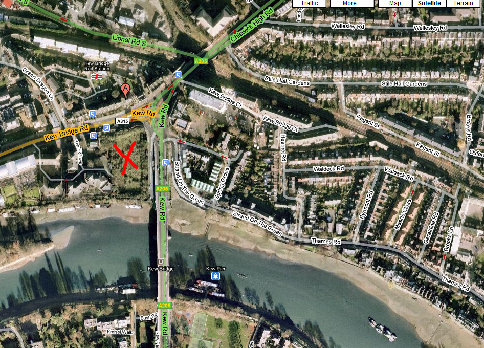 1. Cycle; from central london there is one road with no change. The A315, it changes names to many things but starts south of Hyde Park (as Knightsbridge and Kensington Road) and continues through Chisick (Chiswick High Street) right untill the round about where the camp is setup. From kew bridge the camp can be clearly seen.