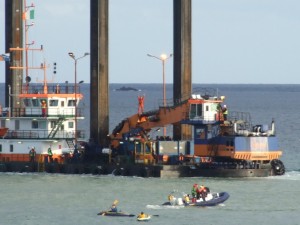 After the dredgers were towed away, the Garda arrived and boarded the ship in addition to the Shell security already on the ship. They threatened the protester on the crane arm with forced physical removal. Fearing for his own safety the protester jumped from the dredger arm onto the deck and dived into the water. The two supporting kayakers who were still in the water were arrested despite their efforts to comply with the Gardai’s instructions. In the water the crane protester managed to avoid capture by the Gardai and Shell security and get to the shore where he scaled a cliff to evade capture. His whereabouts are now unknown but he is safe and well!