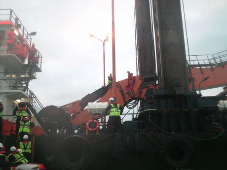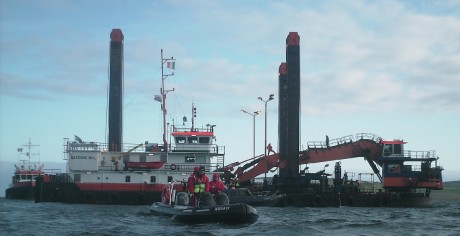 A group of 11 kayakers set out at 5:30am on Friday, meeting instant resistance on the water from Shell security boats and safety boats. After avoiding the Shell private security boats that were attempting to capsize the kayaks, one protester managed to board the dredger ‘Rezende Bol’ owned by Van Oord, who is subcontracted by Shell to do the dredging. This vessel along with another and multiple support and security boats were digging a trench in the seabed in preparation for the gas pipe-laying ship Solitaire. Work in the bay has been continuous 24 hours a day since Monday evening only stopping due to the previous dredger occupation by Shell to Sea protesters which lasted 10 hours. During the attempts to board the dredger several protesters were able to climb onto the side of the vessel. Excessive force was used to prevent them from boarding; one protester had his thumb bent backwards by a security guard and later was taken to the hospital where tests revealed damaged ligaments. Another protester who got on board the ship was violently pushed from the deck by two security guards injuring his back, and fell over six feet from the deck into the water. Shell security were kicking and stamping fingers of protesters on the near side of the vessel, all the while one protester managed to board the ship on the other side and climb up onto the same crane his friends had previously occupied just three days earlier.