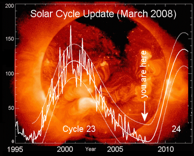 Sunspot Cycle 24, expected to peak around 2012, could be one of the strongest in centuries. It will be 30–50 percent stronger than the last one and begin as much as a year late, according to a breakthrough forecast using a computer model of solar dynamics developed by scientists at the US National Center for Atmospheric Research (NCAR).