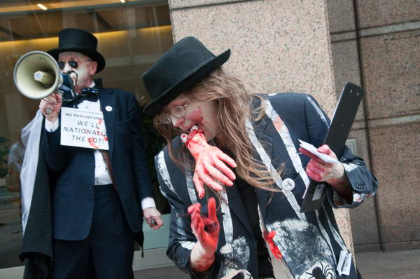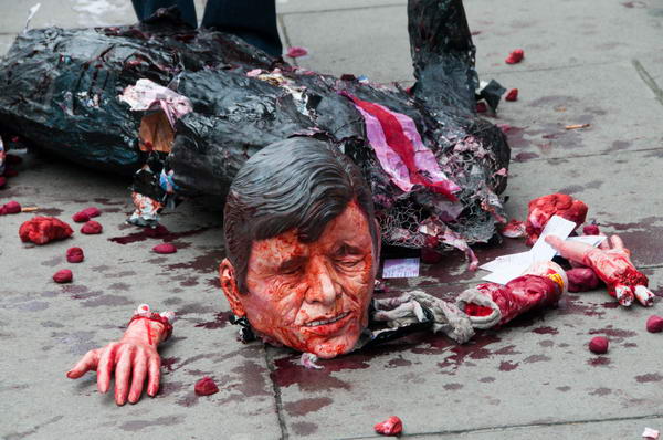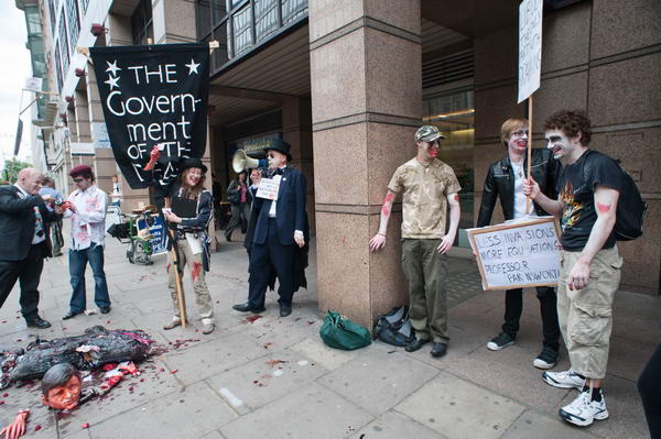 Brown himself was in a sorry state. I'd watched his head torn off and his limbs dismembered, and now the zombies were trying to eat the revolting bloody mess from inside his torso. The dummy (it is really was a dummy, not just a figure of speech about our revered leader) was in pretty poor shape, rather like New Labour, outside whose HQ on Victoria Street we were. Even the best efforts of the zombies to bring him back to life were fruitless.