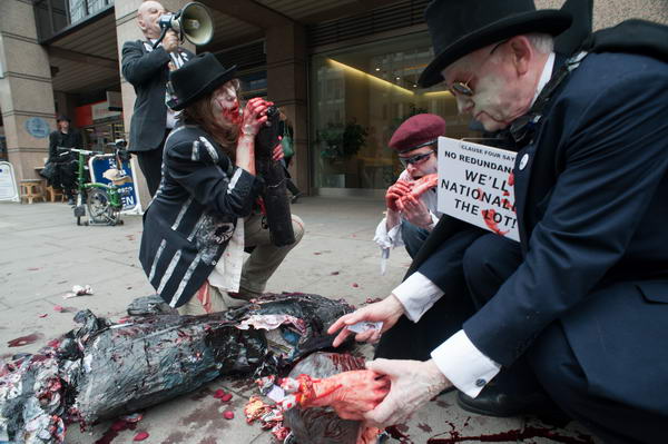 Around Knight’s neck was a placard with a simple solution for a current problem: "No Redundancies - we'll nationalize the Lot!"