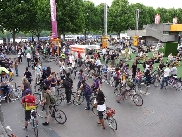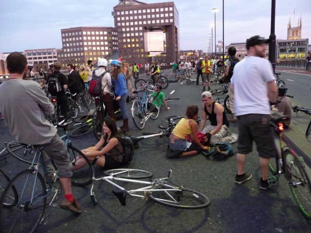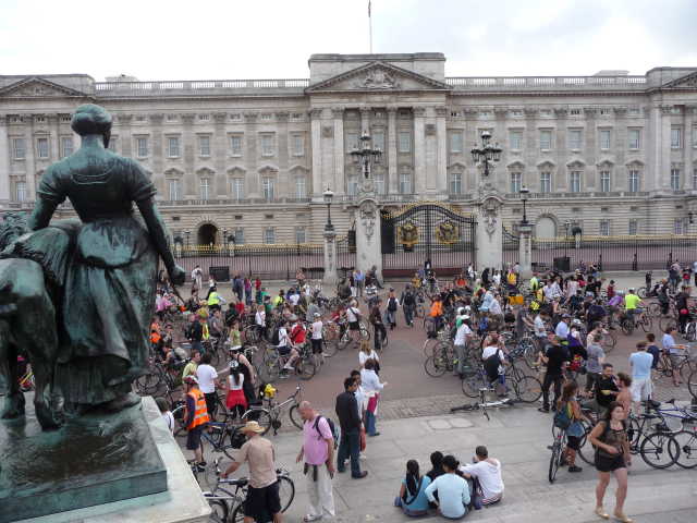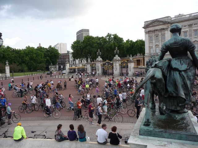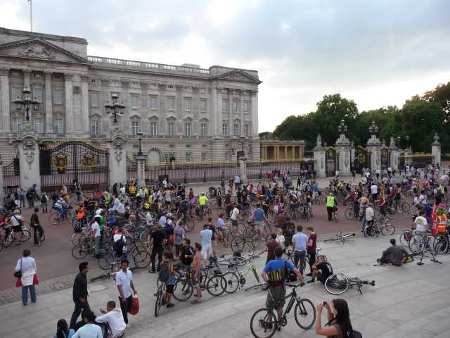 Several circuits of Parliament Square. A pleasant stop at Buckingham Palace where the ride with its loud music seems to be very well tolerated by the residents, unlike past experiences in the zone around Parliament. Finally a bike-high and sit-down on London Bridge.