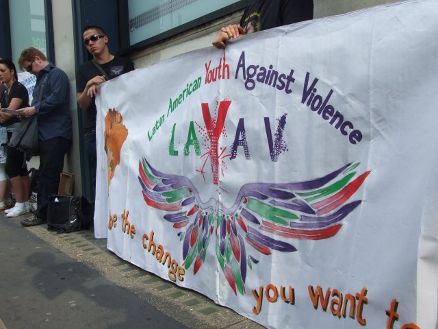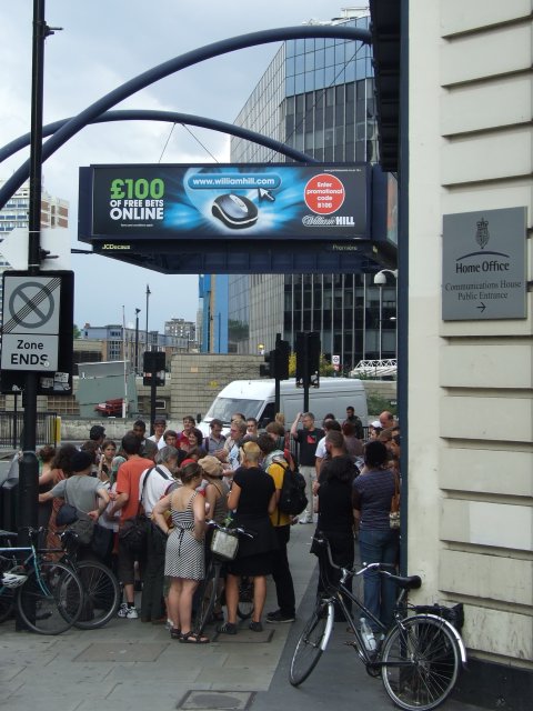 About 50 people gathered today outside Communications House, one of London's two immigration reporting centres and so-called 'short-term holding facilities', to protest against immigration detention and deportation and show solidarity with the Yarl's Wood hunger strikers. Many leaflets were given out and chants of 'No borders, no nations, stop deportations' filled the air of Old Street. One of the hunger strikers addressed the crowd on the phone and speakers, including an ex-Yarl's Wood detainee, delivered moving speeches about the inhumane conditions inside detention centres and migrants' struggles against the government's racist immigration policies.