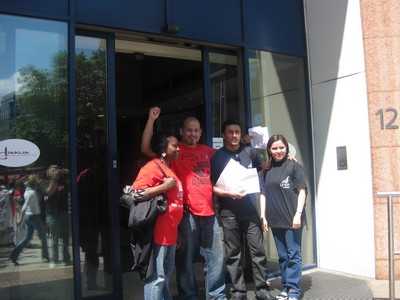 Photo: Alberto (red t-shirt) supporting Willis cleaners sacked by Mitie as they handed in a petition asking for their union Unite's official backing for their five month old protests. (May 2009)