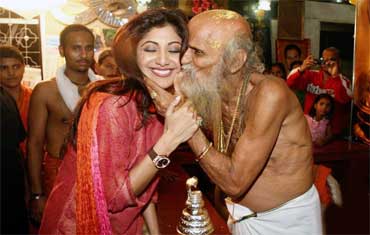In the series of photographs the priest is seen performing puja. The temple priest was so happy with the actress' visit to their temple that he could not hide his thrill and cast a kiss on Shilpa. This kiss has landed her into controversy with many social groups claiming it to be obscene which had hurt the religious sentiments of many.