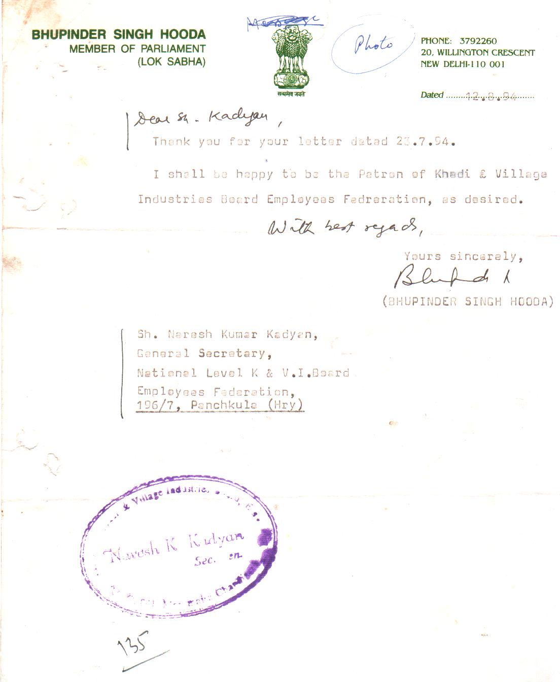 http://en.wikipedia.org/wiki/Bhupinder_Singh_Hooda , former chairman, KVIC Bhai Laxmidas as President and Naresh Kadyan as Secretary General of the National Khadi and Village Industries Board's Employees Federation (An apex body of all India state KVIB's employees unions) -