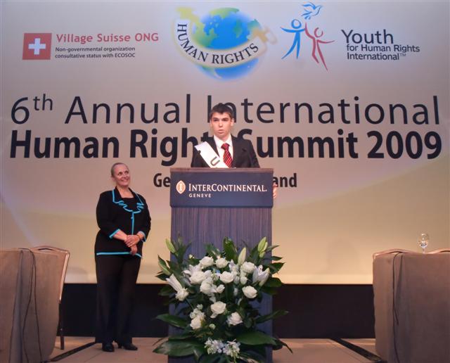 Delegate Dustin McGahee of Youth for Human Rights Florida represented the United States. Speaking among an impressive roster of international ambassadors, academic and religious leaders, he pointed to the vital necessity of improving human rights worldwide, in developed as well as underdeveloped countries. Just 18 years of age, McGahee moved the audience with his speech, reminding representatives from around the world that, “What you do in the near future determines whether entire societies will live under darkness and suppression, or if they will thrive with a life full of Human Rights.”