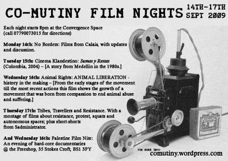 Thursday: Tribes, Travellers and Resistance. With a montage of films about resistance, protest, squats and autonomous spaces; plus short-shorts from Sadministrator .
