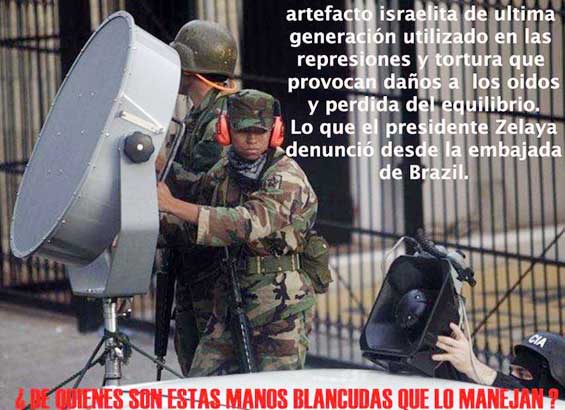 The text on the photo speculates that the agent wearing the CIA cap is Israeli because it is Israeli LRAD, but the simpler solution is it is the CIA using bought Israeli technology. It's a far bigger story if it is just CIA as Israel has openly supported Honduran dictatorships and the CIA claim not to be supporting this one.
