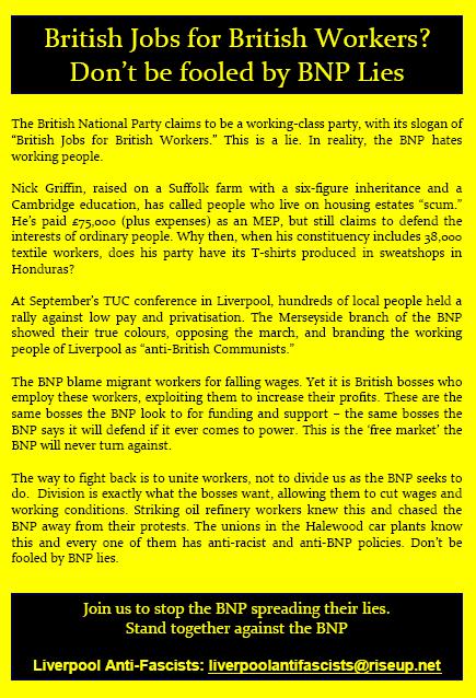 liverpoolantifascists@riseup.net Download the Liverpool Antifascists leaflet, "British Jobs for British Workers? Don't be fooled by BNP lies," here: