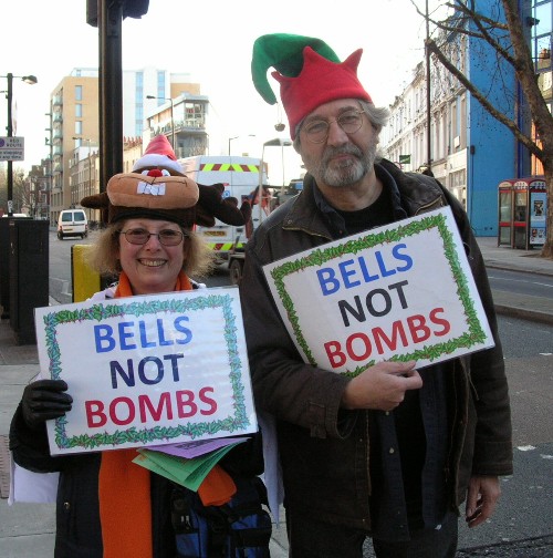 FOURTEEN anti-nuclear peace campaigners from Trident Ploughshares affinity group the Muriel Lesters, the London and Oxford Catholic Worker, Campaign Against Arms Trade, World March for Peace and Nonviolence and Kingston Peace Council and friends dressed in white “weapons inspector” overalls and festive hats and decorations, serenaded employees of nuclear weapons manufacturer Lockheed Martin outside the US arms giant’s central London office on Thursday 10 December, UN Human Rights Day. They brought messages of peace and condemnation through the verses of popular festive tunes with specially-modified lyrics and called for the suspension of work on existing nuclear warheads and on the construction of new facilities and research to develop a new generation of warheads at the Atomic Weapons Establishment (AWE) sites at Aldermaston and Burghfield in Berkshire, south-east England.