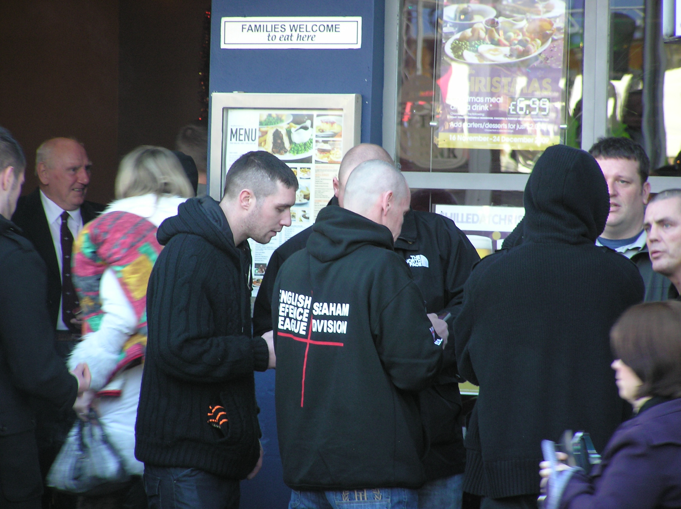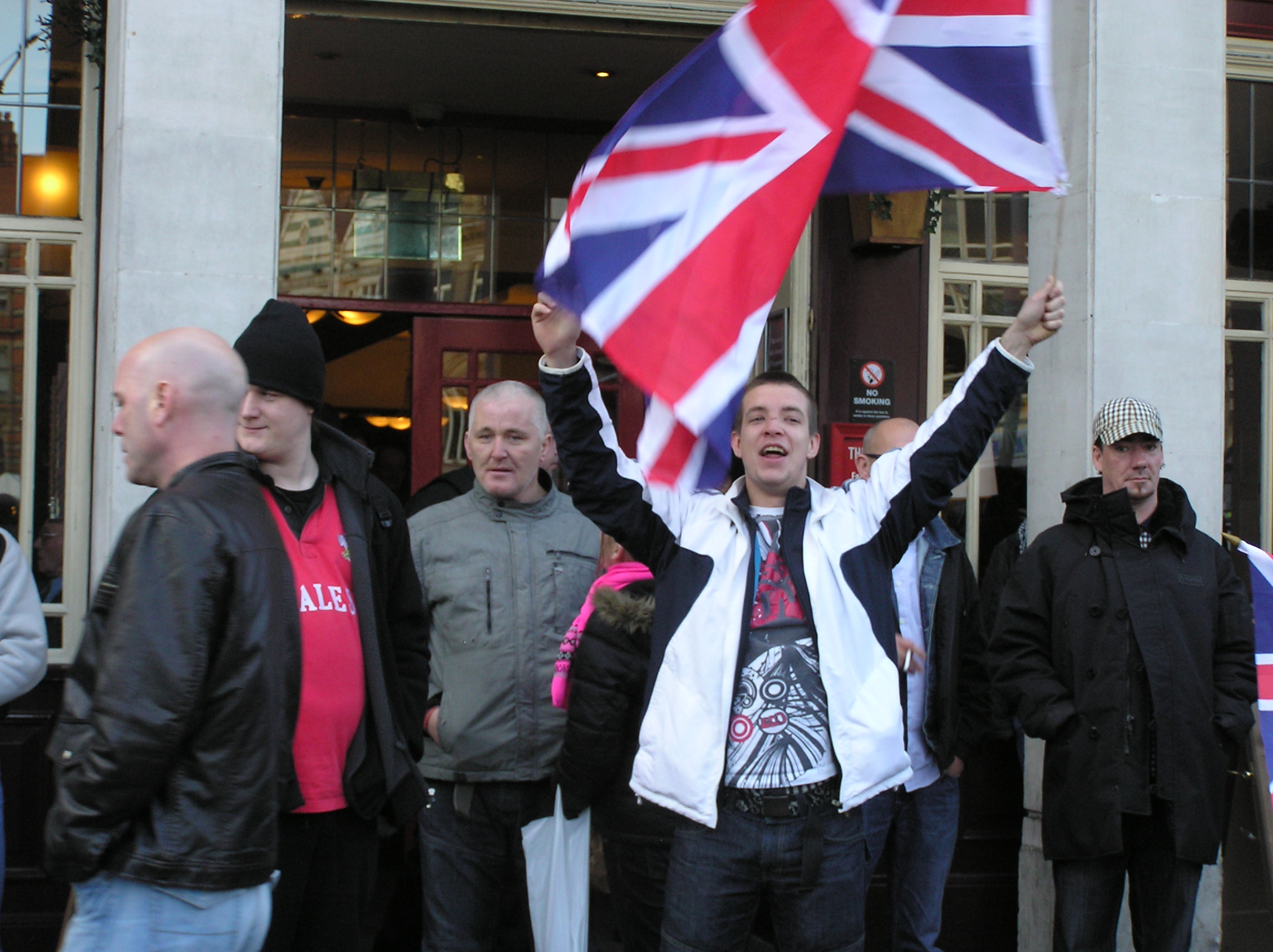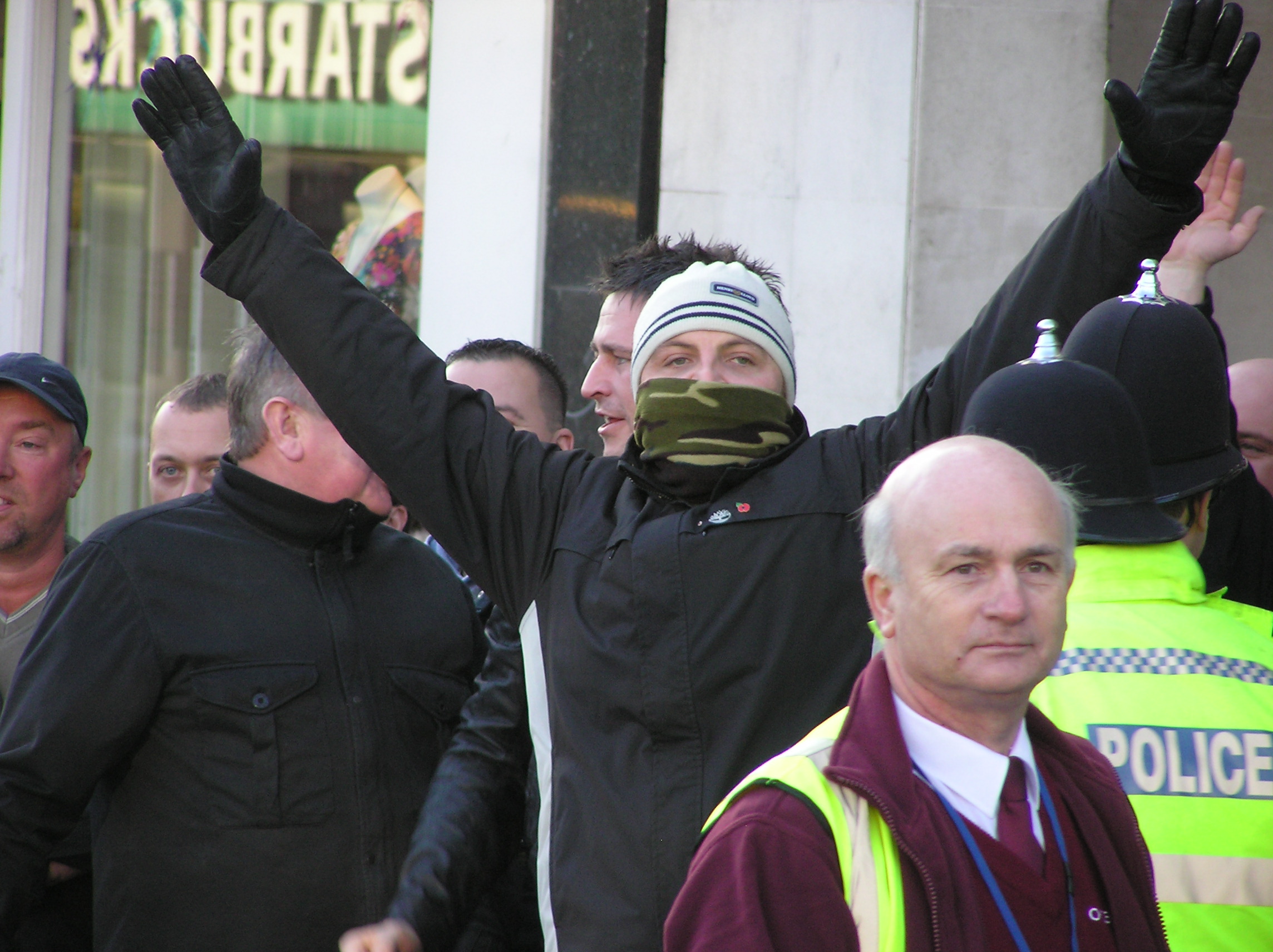 Those arn't nazi salutes we were just waving to a nice old grannie who buys us cakes but the picture came out wrong. We're certainly not hooligans, its not just the fact we're always surrounded by police and or so called 'anti-facists' (WHO ARE ACTUALLY FACIST COMMUNIST CONSPIRITORS WHO WANT TO RULE THE WORLD) that keeps us from being violent. those people that ctually DID cause violence in the summer were like these other guys who we dont know, dispite the fact that guys that look like them, with the same names, come to our marches."
