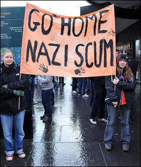 Of course the fight against fascism is not just conducted on the campaign trail but also on the streets and it is here that the far-right have been most visible in the last 6 months. What the next year brings will be interesting. The EDL emerged following last year’s Luton demonstration by Muslim radicals and the EDL ranks hold a mix of political views. Although the EDL leadership claim to dislike Nazis they have totally failed to control or exclude them. The view of the EDL on the far right is very mixed indeed. The EDL have flown the Israeli flag on their demos but rather than supporting Israel it is more likely to be used as an irritant: and it has worked to not only enflame Islamic ire but also to alienate the EDL from many on the far right who still go along with all that ‘Zionists- taking-over the world” stuff. However, fascists being fascists, the chance to prove their prowess on the pavement and get their faces in the media is too difficult to resist. The EDL claim that they have mixed race members but these are rarely seen in the photographs and the majority appear to white football hooligans and members of various far right groups.