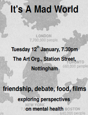 The next meet up of the Notts mental health group 'It's a mad world' will be on Tuesday 12th Jan, 7.30pm at the Arts Org, Station St, Nottingham city centre.