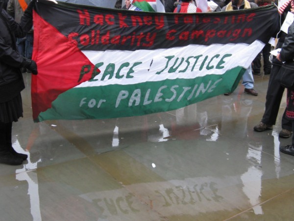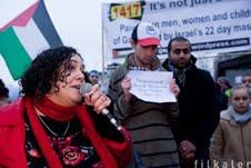 Heavy rain meant that instead of staging a “Die-in”, with people lying on the ground to represent those killed in the attack, those present decided to observe a minute’s silence for the victims. Approximatly 200 people participated with each being given the name of one of the dead to hold aloft. After a perfectly observed silence, three speakers with direct connections to the attack on Gaza addressed the crowd – Sameh Habeeb, a Gazan journalist; Natalie Abou Shakrah, a Gaza survivor; and Manal Timraz, who lost fifteen members of her family in the attack, eleven of whom were children.