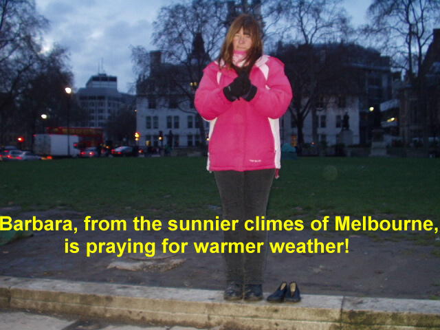 Barbara is used to the kinder climate of Australia's city of literature and she currently lives in a tent, which does not have the amenities enjoyed by the honourable members in the establishment opposite. She is currently praying for warmer weather as she and Brian continue their quest for peace and justice during the coldest British winter in 30 years.