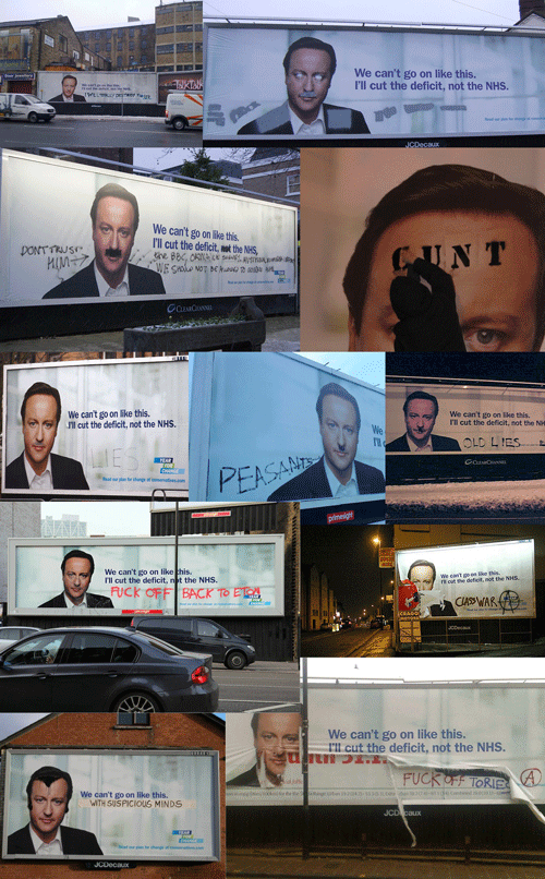 To every freethinker, radical, true revolutionary and anarchist across Britain who wants to make a serious change then we ask you to fight the oncoming election campaign tooth and nail on two fronts – Firstly attacking, subverting, destroying any propaganda put out by all political parties as well as hassling any politicians on the streets etc, Secondly filling the void with anarchist ideas – from free local sheets, public meetings, rallies or community projects – putting into action our ideas on mutual aid and solidarity. The time for real radical change is NOW and as Anarchists we need to be the driving force of the revolutionary current. The opening victory against the Cameron posters shows us how small actions across the country can have a massive impact which were widely received with support from the public and a clear example of the current feelings of the time. But this is only the beginning and we must take it further.