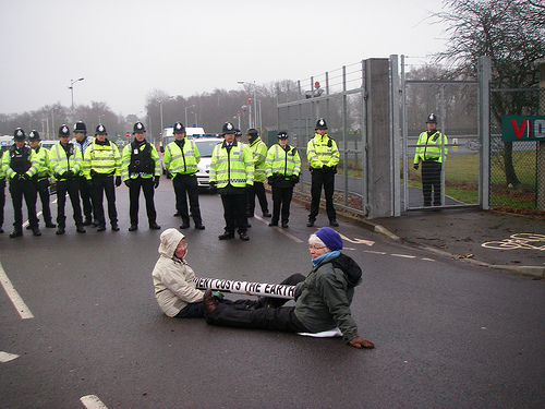 The blockaders either sat or stood in front of the gates or lay down, linked together with arm tubes and locks, or with their hands superglued together. The police had to deploy specialist cutting teams to release many of the protesters. Most of those blockading were removed without being arrested, even though many were in place for several hours.