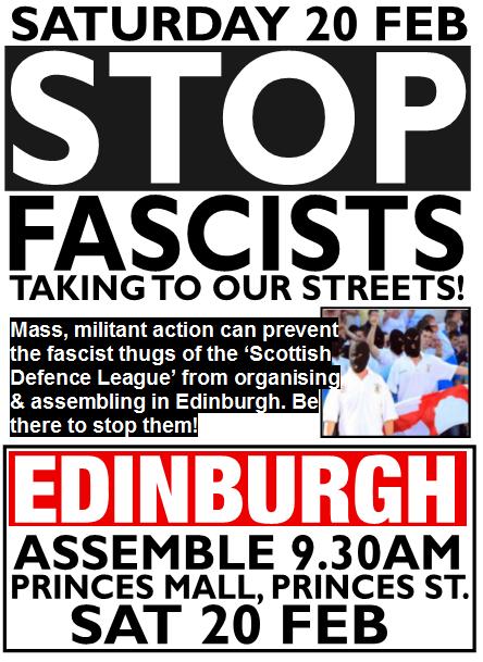 http://scalp.noflag.org.uk/EdinSDLbustcard.pdf Edinburgh Anti-Fascist Alliance will have scouts around the city, and once we have discerned the location of the SDL demo, we will march there and attempt to prevent the fascists from marching and taking control of our streets.