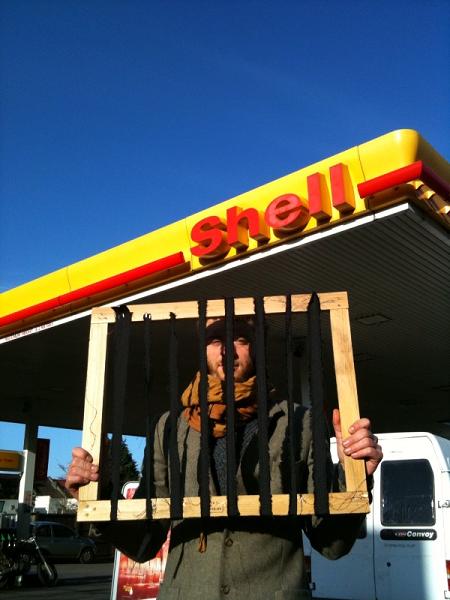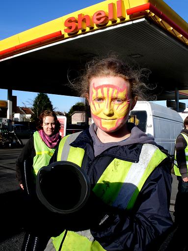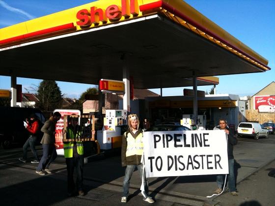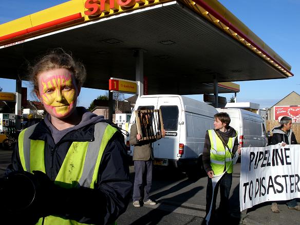 Rachel Keevil from Rising Tide, chasing another activist with a large section of pipe, said “Shell are climate criminals. The gas pipeline in County Mayo will damage the environment and threaten the health and livelihoods of local people; all for the profit of Shell. It’s a pipeline to disaster.”