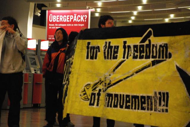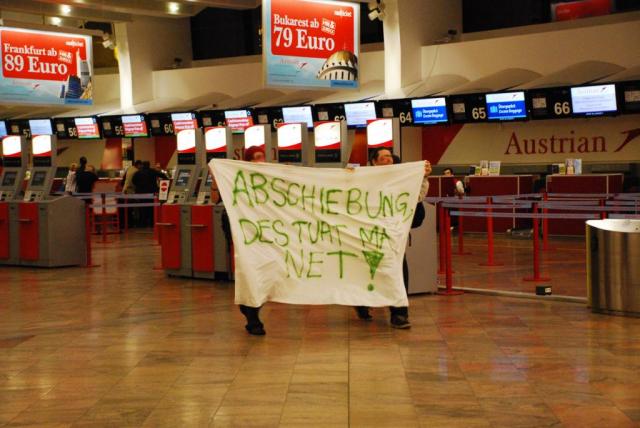 There was a demonstration in front of the Vienna deportation prison, but lots of police made every intervention impossible. So some 300 joined a spontaneous ralley against deportations. In the evening, some 50 people went to the Vienna International Airport and made a noisy demonstration there (see the fotos from the airport protests).