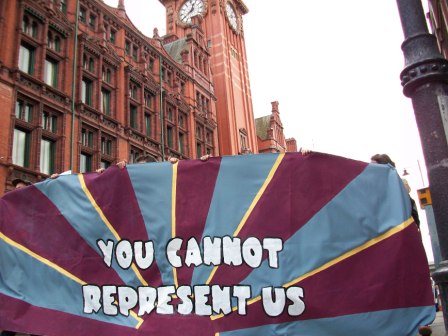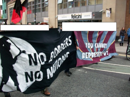 Anti-authoritarians, including from No Borders and the Anarchist Federation, had a decent presence on the march and in town early in the day, distributing lots of literature critical of representational politics. Due to the low profile of the march in Manchester, this was no easy task and we confirm our commitment to mobilise for it in the future.