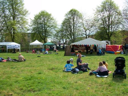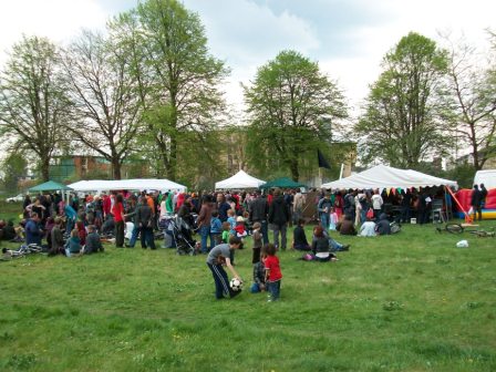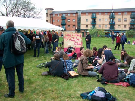 Others had been busy all morning setting up marquees and a soundsystem on Birley Fields, Hulme. The Fields are due for development by Manchester Metropolitan University and Hulme residents have set up a campaign to save them. A speaker from the campaign described them on the day as 'the green lungs for the working people of the area'. The overwhelmingly positive response from Hulme residents to our presence there shows the great value of this land for the area.