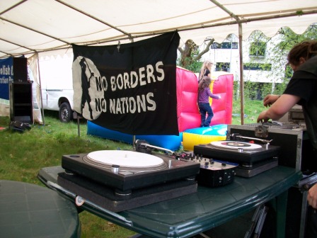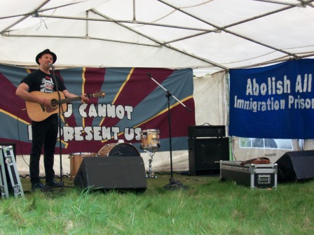 With the rain staying away unexpectedly, the site quickly filled up towards the afternoon with over 200 people coming and going throughout the day. Due to the great work of a Manchester free party crew, music started bang on time at 3pm with a set by Attila the Stockbroker and David Rovics who kindly passed by on the way to their Bradford gig. They were followed by a diverse range of performers and bands from reggae via punk to folk until it got dark. An open-mic speakers corner between the acts saw people from various campaigns talk about government cuts to service and politics away from the ballot box.