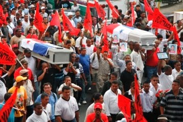 Protests by plantation workers in the Bocas del Toro province on the 9th of July led to street fighting with police, who were ordered in by president Ricardo Martinelli. Demonstrators burned down a bank and several other businesses were attacked, while roadblocks were set up around the Atlantic city of Changuinola. The rioting has led to the death of two workers at the hands of police – named as Antonio Smith and Fernán Castillo - and the wounding of more than 100 more. Over 115 workers were arrested, while demonstrating workers took four police officers hostage. Union official Rafael Chavarria has claimed that the situation is much worse than the government version of events, and that a further four protesters were killed.