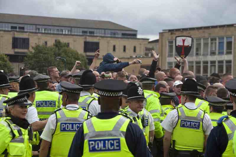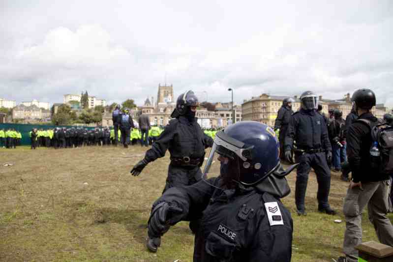 Despite hailing Bradford as ‘the big one’ only 700 EDL supporters turned up compared to 900 at last year’s Leeds demo. Feeling a little frustrated by this the ‘non-violent’ and ‘compliant’ EDL began to throw bottles, rocks and smoke bombs at the police and anti-fascist demonstrators. What’s that old saying about leopards and spots?