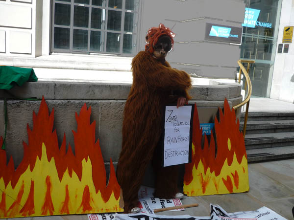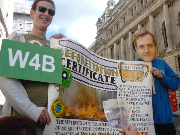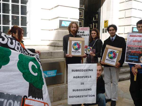 Activists outside the Department of Energy and Climate Change protest against government subsidies for agrofuel burning power stations.