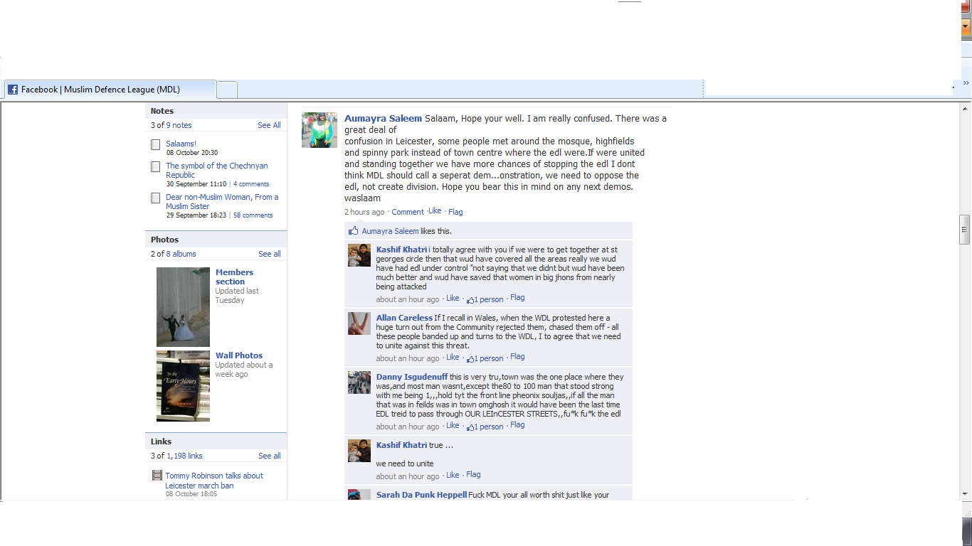 MDLmembers were left stranded, wondering alone in Leiecester and vulnerable to EDL having been given wrong directions to the rally by MDL leadership over facebook and MDL radio. MDL members criticised their leadership [removed] also known as Admin T / Bengal Tiger / Joe MDL and the Chechnyan Wolf / Admin F as they were told to meet at Spinney Park away from the main protest. They had been due to meet at a Leicester mosque but the Imam at the mosque asked them not to. The UAF met in another location in Leicester for a diversity celebration rally against the EDL.