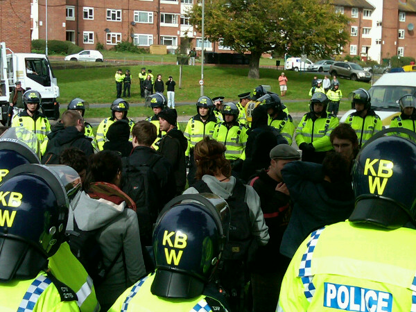 14.10 - People kettled on Lewes Road. A number of arrests have taken place. Police claim arrests are to "prevent a breach of the peace in a Residential Area". Argus claims that those who refuse to identify themselves are being arrested.