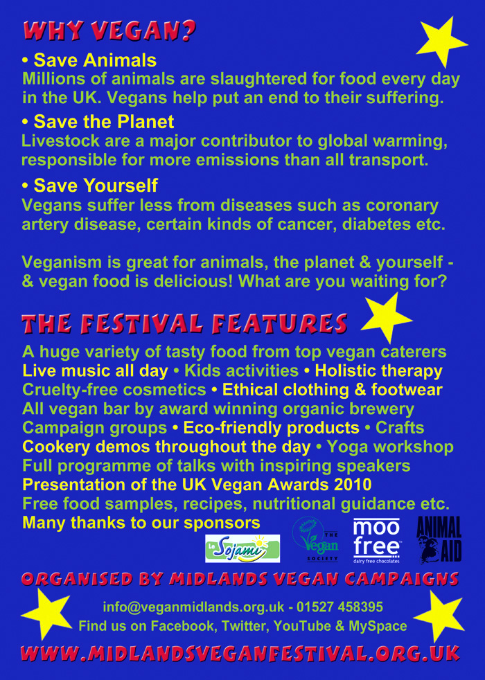 For many more details of all of the attractions at this event, please check out the website www.midlandsveganfestival.org.uk and you can follow updates on Facebook, Twitter, Myspace etc.
