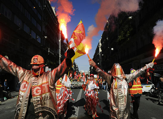 One of Osborne’s announcements was that the British state pension age would go up to sixty-six, a rise of six years for women. French workers are angry about having to wait until sixty-two for their pensions, but that is just the tip of the iceberg, and merely the latest reactionary reform introduced or threatened by Sarkozy’s Union for a Popular Movement government. While there have been large numbers at union-organised rallies, a series of rolling strikes has paralysed key industrial sectors, and occupations of oil depots have raised the prospect of bringing the whole country to a standstill.