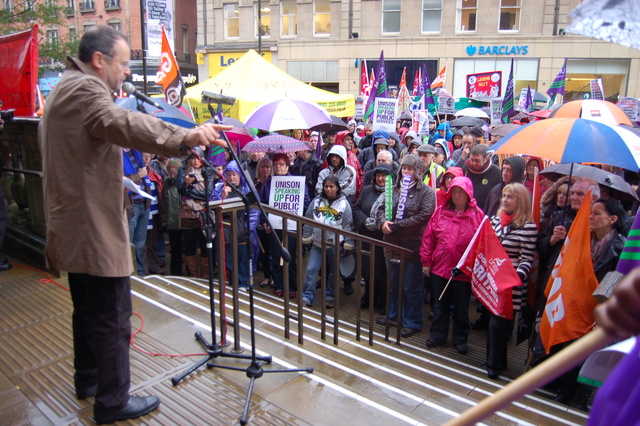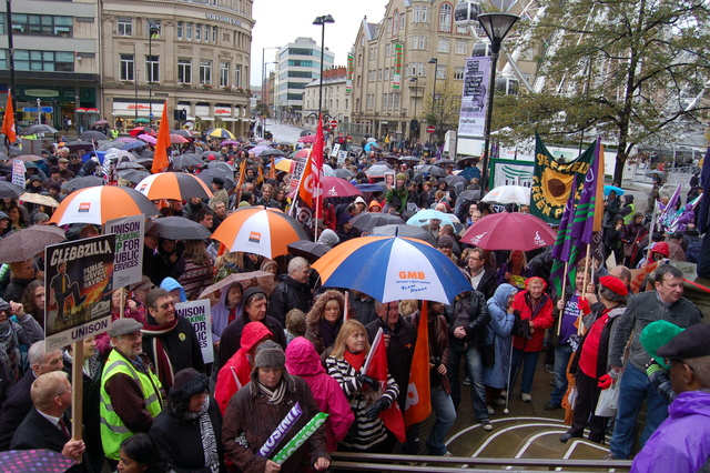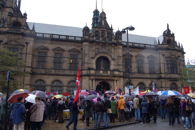 On Saturday 23rd October 2010 around 1,000 protestors from across the Yorkshire region assembled outside Sheffield Town Hall to be addressed by speakers from the established labour movement.