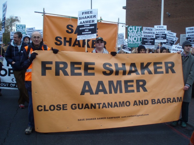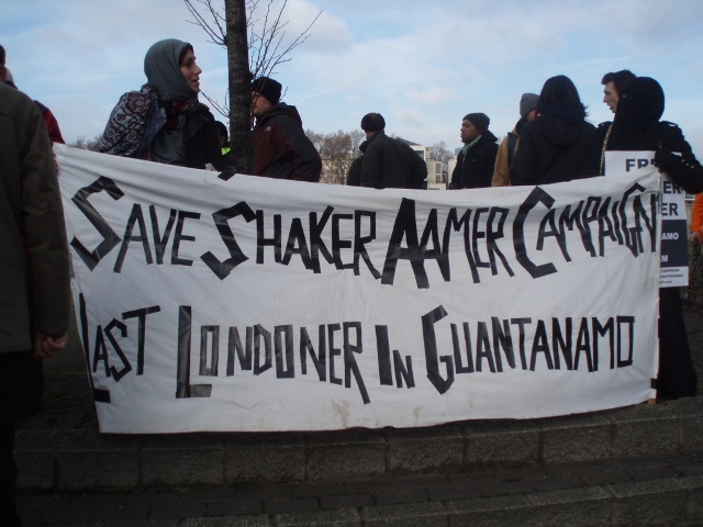 The Save Shaker Aamer Campaign (SSAC), along with numerous other human rights organisations, including the London Guantánamo Campaign, trade unions, political parties and social movements organised a day of action, involving a rally, march, public meeting and film showing to put pressure on the British government to press for the release and return of Shaker Aamer, the last British resident held at Guantánamo Bay, to this country. Shaker Aamer, a 42-year-old Saudi national, with a British wife and four British children, has been held illegally, without charge or trial at Guantánamo Bay for almost nine years. The British government does not consider him a threat and sought his return to the UK in August 2007. Four other men, whose return was also sought at that time, have long since returned. Following the out-of-court settlement made with former prisoners last month in a case concerning the UK’s involvement in their torture, the British government announced it would be stepping up its efforts to seek his release. Since then, Foreign Secretary William Hague and Deputy Prime Minister Nick Clegg have spoken to Secretary of State Hillary Clinton about his case. Unfortunately, Mr. Aamer is still held at Guantánamo Bay and since the election of a Republican Congress in the US, efforts are being made by American politicians to block the release of any more prisoners.