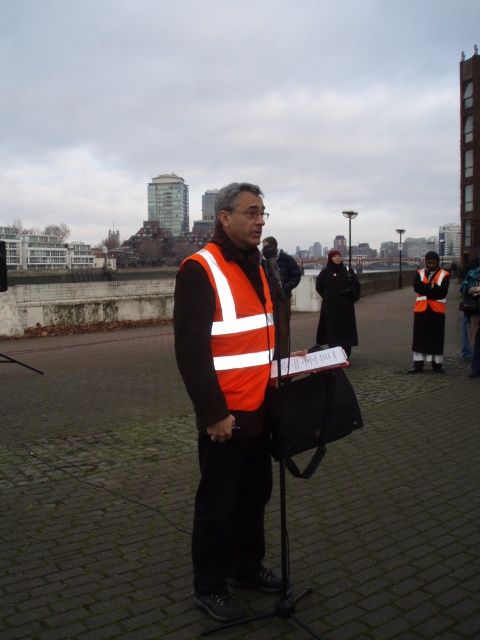 Campaigners from London and other parts of the UK took part in the day of action on Saturday 11 December, which kicked off at the site of the new American Embassy in Nine Elms in Vauxhall, south London. About 70 people took part in a rally at midday overlooking the River Thames which was addressed by former Labour MP for Battersea Martin Linton, who had campaigned for Mr. Aamer’s release while his MP, Chris Nineham from the Stop The War Coalition, Sheikh Suliman Gani from Tooting Mosque and Joy Hurcombe from Brighton Against Guantánamo, reading a message of support from Jeremy Corbyn MP. The rally then set off on an hour and a half long noisy procession from Vauxhall to the Battersea Arts Centre for a public meeting in the afternoon attended by around 100 people. Speakers at the meeting included current Battersea MP, Jane Ellison, who since being elected in May has also worked hard and pressed her government and others in parliament to take action for the release of Shaker Aamer, his solicitor Gareth Peirce, journalist Yvonne Ridley, Sheikh Suliman Gani, Lindsey German from the Stop The War Coalition, Moazzam Begg and others.