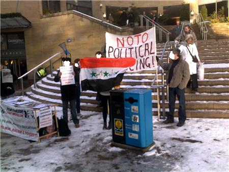 One of the above photos displays a comrade waving an Iraqi flag separately from the political policing protest. One of the reasons for this was to raise awareness that there is still support for the Iraqi people’s struggle, especially in a country which generally ignores their movement.
