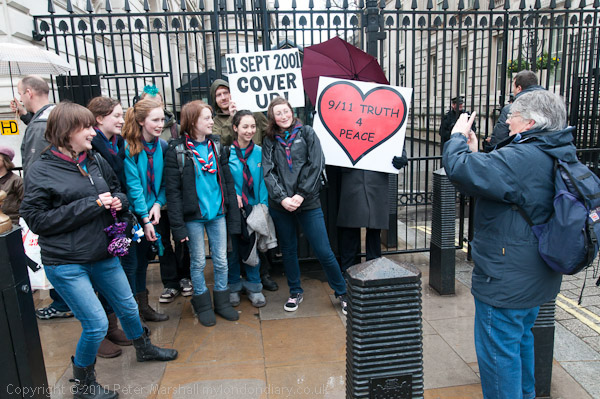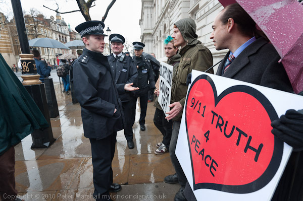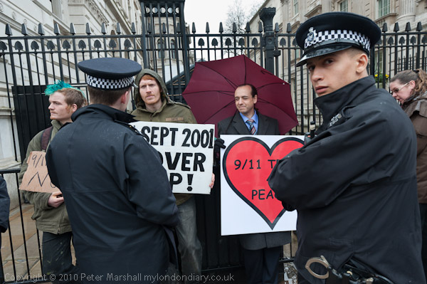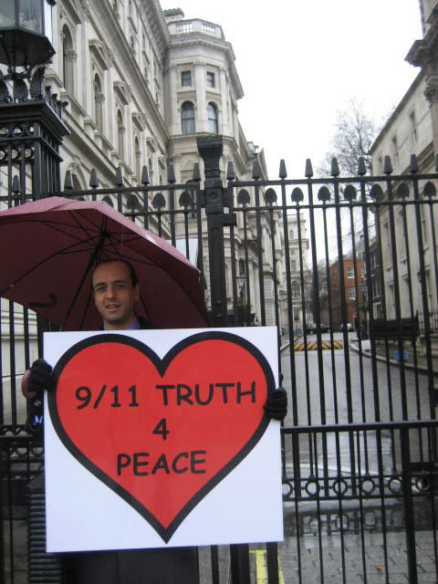 http://911truthnews.com/civil-disobedience-at-the-white-house-for-911-justice-2, a second action was held on the 26th February. After meeting at 12pm near Trafalgar Square we headed down Whitehall to Downing Street and took our positions outside the gates of Downing Street. On one side of us was a constant stream of photo-taking tourists and on the other 3 machine gun-toting policemen.