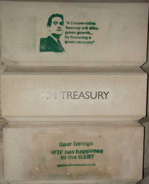 On the masonry next to his face a pre-election quotation reads: ‘a Conservative Government will drive green growth [...] by financing a green recovery’. Beneath it is stenciled: ‘Dear George, WTF happened to the G.I.B?’ Today the Chancellor will announce that the Green Investment Bank will not be allowed to borrow money until 2015.